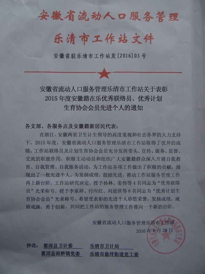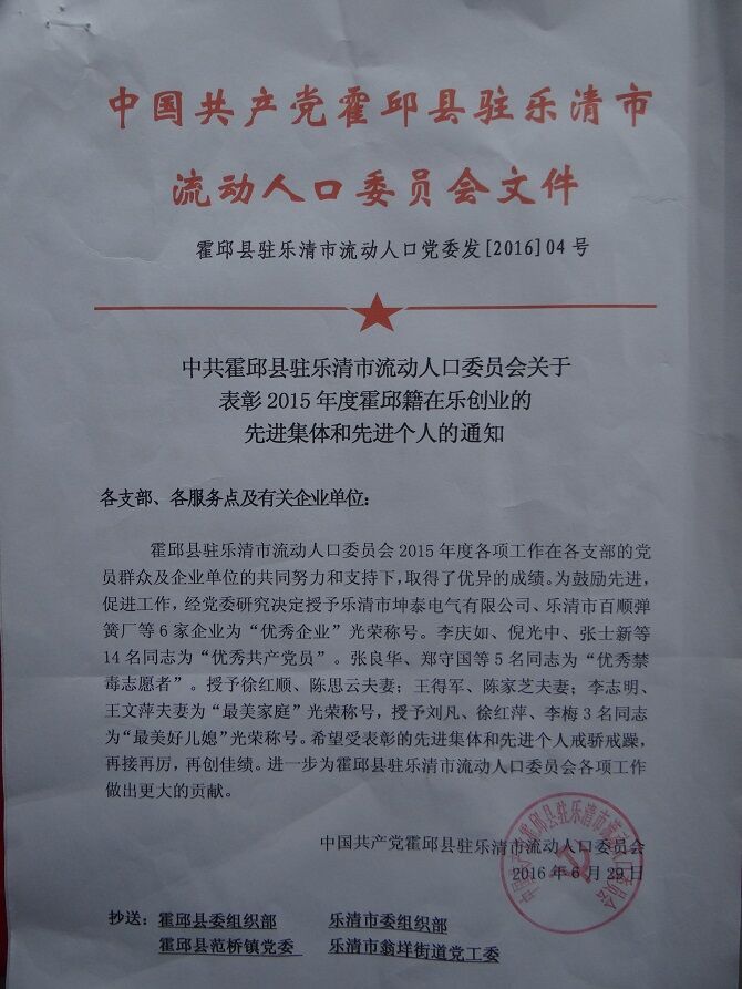 | 霍邱县驻乐清市流动人口党委庆祝中国共产党建党95周年暨2015年度总结表彰大会 |