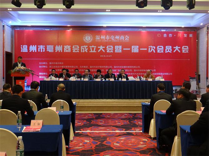 2016年12月27日,温州市亳州商会成立大会暨一届一次会员大会在温州市华侨酒店四楼会议室隆重召开。温州市原市委常委郭登名,温州市工商联总商会副主席兼秘书长赵文冕,亳州市政协副主席、工商联总商会主席张国芳等领导出席成立大会、安徽省流动人口服务管理乐清市工作站站长、霍邱县驻乐清市流动人口党委书记陈孝明应邀出席。友联企业、新闻媒体等共300余人参加。 成立大会上首先审议通过了《章程》(草案)、《会费管理办法》(草案)、《选举办法》(草案)及确立了“心合作,共发展”的办会宗旨。 会议随后选举了第一届理事会成员10名,并由理事会选举产生了第一届商会会长,浙江店里店外餐饮管理有限公司董事长周大磊当选为会长,并做重要讲话。周大磊指出,温州市亳州商会的成立是具有特殊意义的,是温州、亳州社会经济生活中的一大盛事,从此,在温州市的亳州籍商业人士组成了一个共同的大家庭。同时提出,商会作为党和政府联系非公有制经济人士的桥梁和纽带,是政府管理公有制经济的助手。今后,商会将秉承本会宗旨,依靠理事会的力量,发挥全体会员的共同智慧,全心全意为亳州在温州的企业、单位服务,不断开创商会工作的新局面。 按照议程,会上又成立了商会拓展型党支部,并特别邀请霍邱县驻乐清市流动人口党委作为商会党建业务指导单位,对商会党支部各项党建工作给予指导,并积极探索党建工作与企业发展互促共赢的有效路径,努力实现党建提升与企业发展的良性互动,最终达到共建、共享、共荣的良好局面。 温州市亳州商会的建立,为亳州籍企业家朋友搭建了一个相互联络、团结互助的平台,也是安徽各地级市商会和温州加强协作交流的重要桥梁和纽带。”温州市工商联总商会副主席兼秘书长赵文冕希望,在温州的安徽企业能进一步做大做强,积极服务第二故乡的经济社会发展大局。