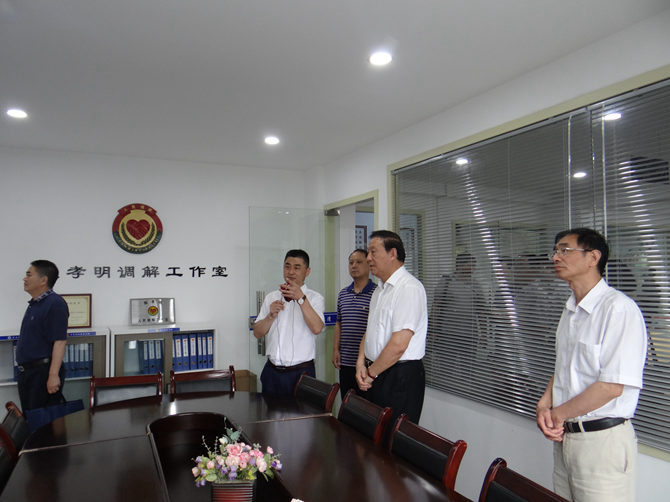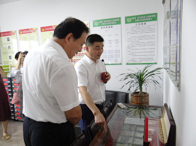 梁卫国一行在协会联合会会长陈孝明的介绍下先后实地查看了安徽省驻浙江省乐清市流动人口计划生育协会联合会图书室、健康家庭讲堂、综治工作室、党员活动室、陈孝明调解工作室等职能办公室,并给予了高度的评价。