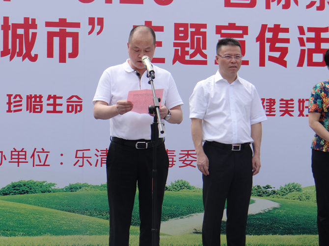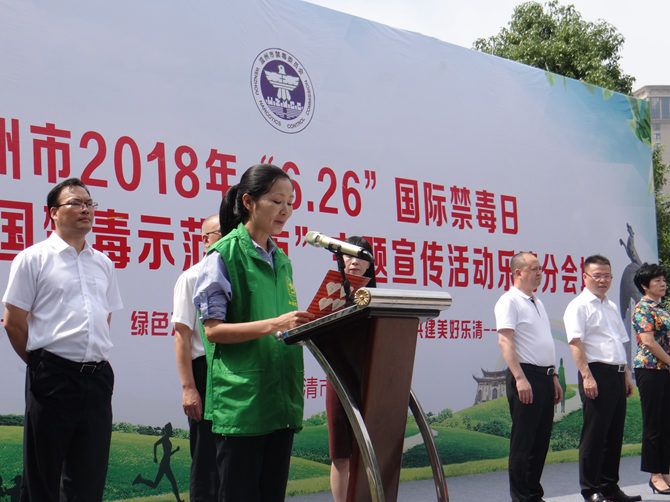 活动仪式上,乐清市民代表“乐清好人”、市和谐志工协会会长余丽娜宣读了《争创全国禁毒示范城市,共建美好乐清》倡议书。