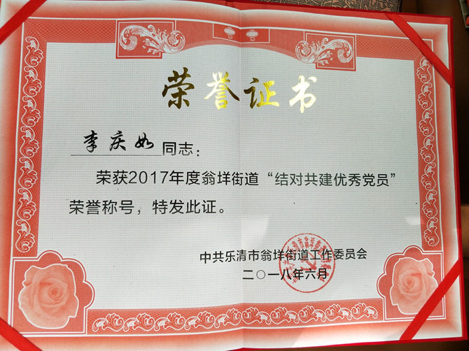 霍邱县驻乐清市流动人口党委作为驻外党委被翁垟街道授予“结对共建先进基层党组织”荣誉称号,霍邱县驻乐清市流动人口党委党员李家祥、李庆如被授予“结对共建优秀党员”荣誉称号。
