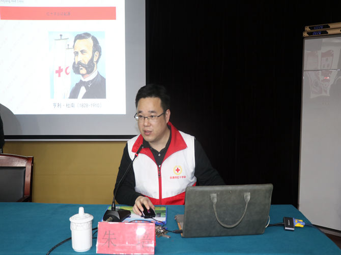 会上,朱老师以PPT的形式,结合生动的案例和视频,深入浅出的讲解了红十字会运动的起源、主要工作职责、各类急救知识、心肺复苏技术要点、胸外心脏按压要领、AED的使用方法及注意事项等内容。