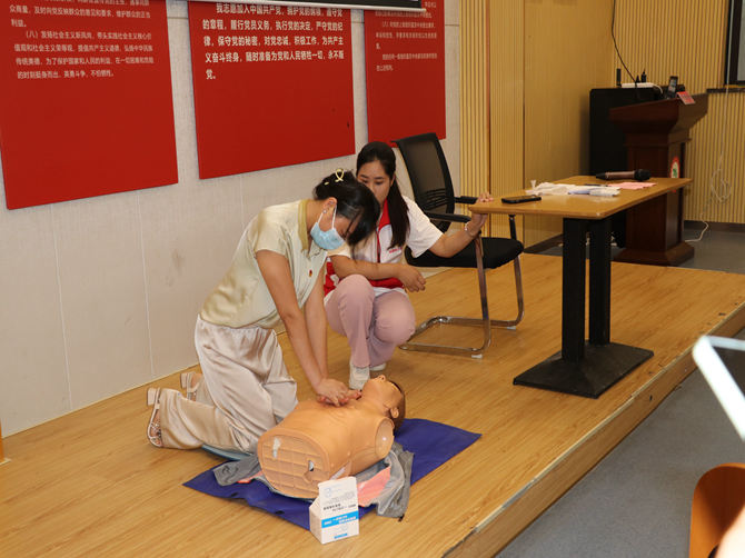 随后,郑倩倩通过生动鲜活的实例与通俗易懂的语言为大家讲解了红十字会的起源、心脏复苏的操作步骤、人工呼吸的要领、AED的操作方法等急救知识。并利用人体模型进行现场示范,手把手教授大家如何心肺复苏及人工呼吸,增加互动体验,更让大家感受到了应急救护知识的重要性。