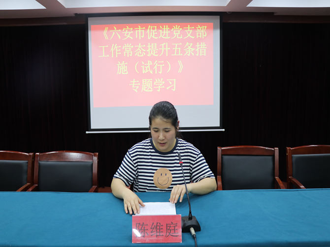 6月29日上午,党委委员陈维庭带领学习《六安市促进党支部工作常态提升五条措施(试行)》,为持续巩固基层党组织标准化、规范化建设成果,全面提升党支部组织力提供了理论保障。