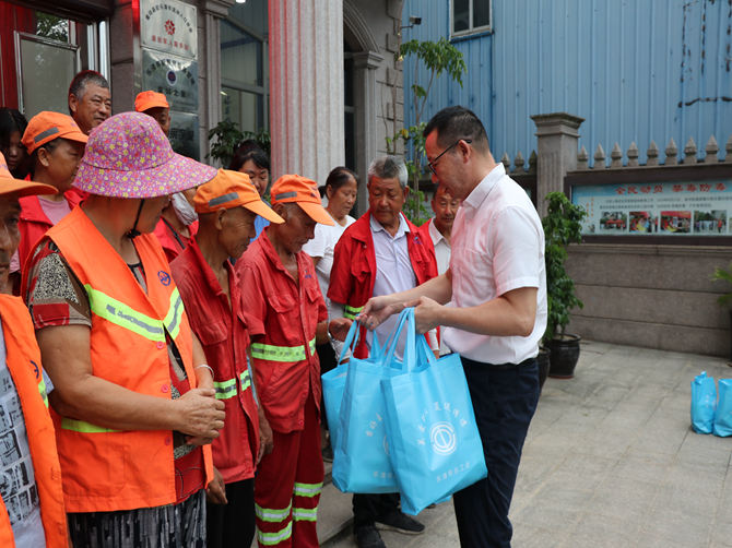 活动现场,市总工会党组书记、副主席林秀在党委书记、工会委员会主席陈孝明的陪同下为环卫工人们递上装有矿泉水、风油精、毛巾等消暑物品的慰问礼包。林秀亲切感谢他们在环卫一线上的辛苦付出,为乐清市容的整洁做出重大贡献,并叮嘱他们一定要在岗位上做好防暑措施,注意工作安全。