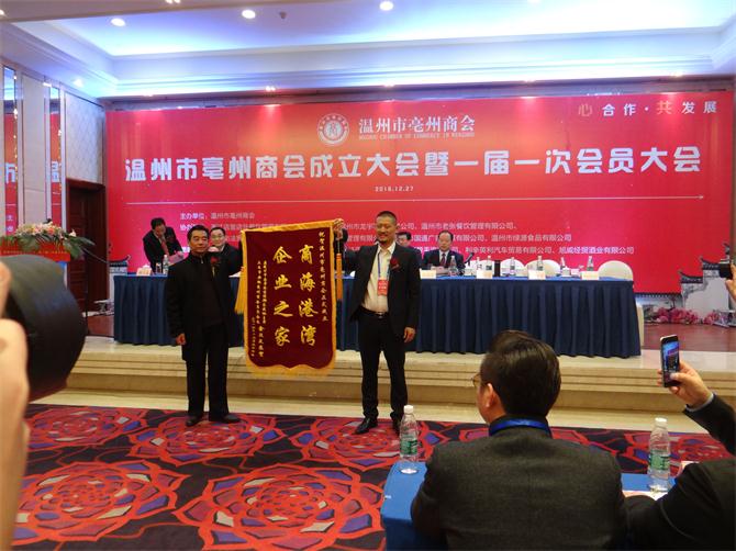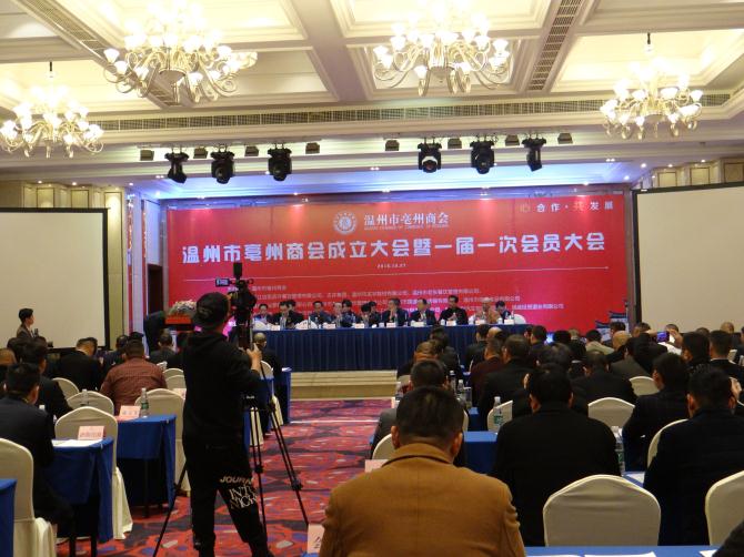 2016年12月27日,温州市亳州商会成立大会暨一届一次会员大会在温州市华侨酒店四楼会议室隆重召开。温州市原市委常委郭登名,温州市工商联总商会副主席兼秘书长赵文冕,亳州市政协副主席、工商联总商会主席张国芳等领导出席成立大会、安徽省流动人口服务管理乐清市工作站站长、霍邱县驻乐清市流动人口党委书记陈孝明应邀出席。友联企业、新闻媒体等共300余人参加。 成立大会上首先审议通过了《章程》(草案)、《会费管理办法》(草案)、《选举办法》(草案)及确立了“心合作,共发展”的办会宗旨。 会议随后选举了第一届理事会成员10名,并由理事会选举产生了第一届商会会长,浙江店里店外餐饮管理有限公司董事长周大磊当选为会长,并做重要讲话。周大磊指出,温州市亳州商会的成立是具有特殊意义的,是温州、亳州社会经济生活中的一大盛事,从此,在温州市的亳州籍商业人士组成了一个共同的大家庭。同时提出,商会作为党和政府联系非公有制经济人士的桥梁和纽带,是政府管理公有制经济的助手。今后,商会将秉承本会宗旨,依靠理事会的力量,发挥全体会员的共同智慧,全心全意为亳州在温州的企业、单位服务,不断开创商会工作的新局面。 按照议程,会上又成立了商会拓展型党支部,并特别邀请霍邱县驻乐清市流动人口党委作为商会党建业务指导单位,对商会党支部各项党建工作给予指导,并积极探索党建工作与企业发展互促共赢的有效路径,努力实现党建提升与企业发展的良性互动,最终达到共建、共享、共荣的良好局面。 温州市亳州商会的建立,为亳州籍企业家朋友搭建了一个相互联络、团结互助的平台,也是安徽各地级市商会和温州加强协作交流的重要桥梁和纽带。”温州市工商联总商会副主席兼秘书长赵文冕希望,在温州的安徽企业能进一步做大做强,积极服务第二故乡的经济社会发展大局。