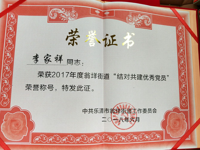 霍邱县驻乐清市流动人口党委作为驻外党委被翁垟街道授予“结对共建先进基层党组织”荣誉称号,霍邱县驻乐清市流动人口党委党员李家祥、李庆如被授予“结对共建优秀党员”荣誉称号。