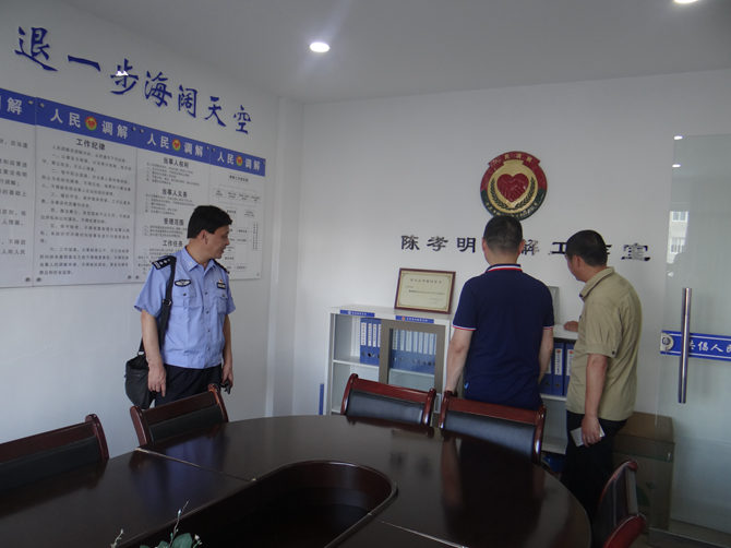 在党委书记陈孝明的介绍下,谷局长先后参观了党员禁毒志愿者基地、乐清市孝明调解工作室等各职能办公室。并对各办公室的主要功能做了全面的讲解。随后针对如何进一步做好社会治安综治维稳工作召开了座谈会。