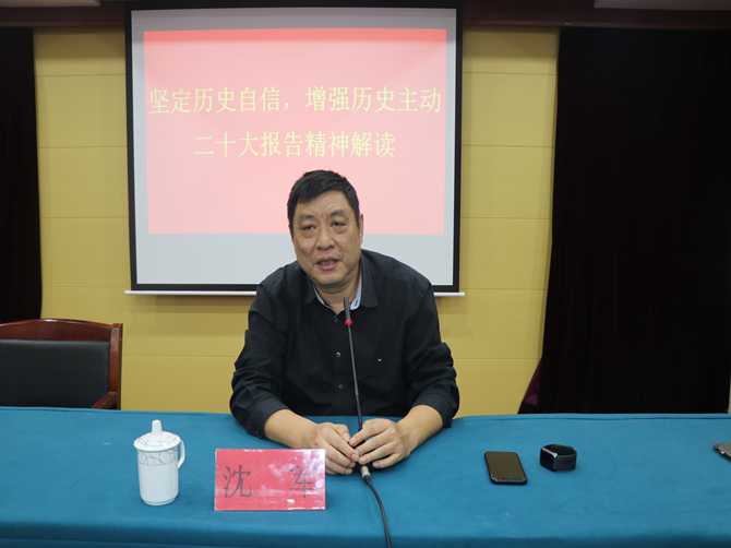沈军首先带领大家集中学习党的二十大报告有关重要论述,根据实际情况对二十大精神进行细致地解读。他表示,历史是最好的教科书,历史认知是历史自信的重要基础。党的历史智慧越丰富,对前途的掌握就越主动。深刻认识和把握中国共产党历史自信的源泉和根基,用历史映照现实、远观未来,才能在新的征程上更加坚定、更加自觉地牢记初心使命、开创美好未来。