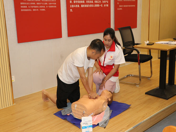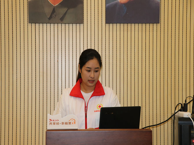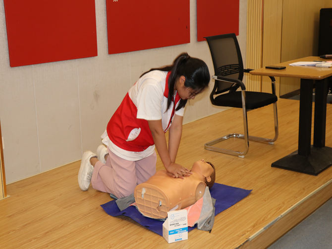 随后,郑倩倩通过生动鲜活的实例与通俗易懂的语言为大家讲解了红十字会的起源、心脏复苏的操作步骤、人工呼吸的要领、AED的操作方法等急救知识。并利用人体模型进行现场示范,手把手教授大家如何心肺复苏及人工呼吸,增加互动体验,更让大家感受到了应急救护知识的重要性。
