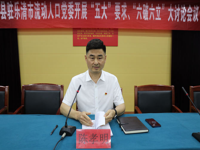 为深入学习省党政代表团赴沪苏浙学习考察总结交流会主要精神,及7月18日六安市大讨论动员会议精神,2023年7月22日,霍邱县驻乐清市流动人口党委在三楼会议室开展“五大”要求、“六破六立”大讨论会议,党委书记陈孝明带领学习,70名安徽籍党员参加。